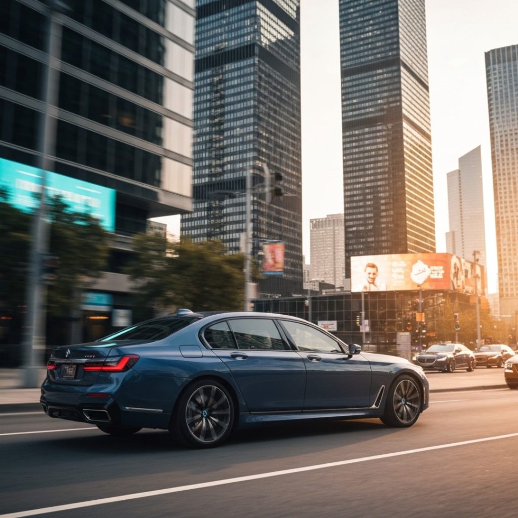 BMW 7 Series 2025 in a busy, upscale urban environment (e.g., a five-star hotel driveway in Mumbai).
