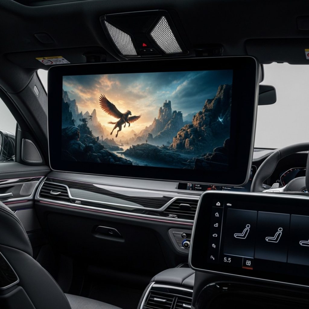 The Hardware: A single, massive $31.3$-inch, $32:9$ ultra-wide screen drops down from the roof lining in the rear. It has an incredible $8K$ resolution and integrates Amazon Fire TV built-in, offering direct streaming via the car’s $5G$ antenna.
