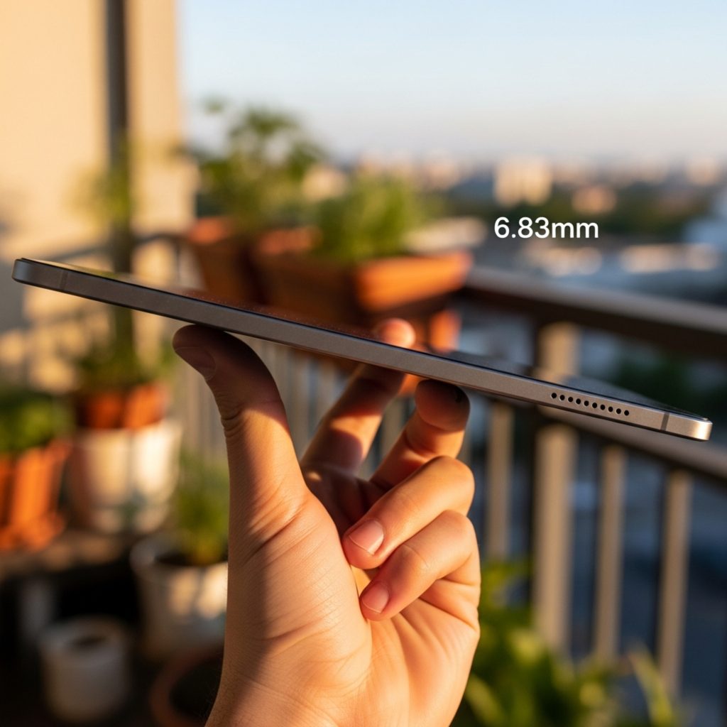 The build is solid—a mix of metal and high-quality matte finish. The Shadow Black variant has a sophisticated, carbon-like texture that resists fingerprints much better than the Lavender Drift (Wi-Fi only). At 6.83mm thickness, it’s incredibly thin, though the weight has crept up to nearly 600g. It feels substantial in the hand—not “cheap,” but you will definitely feel the weight during long reading sessions if you don’t use a stand.