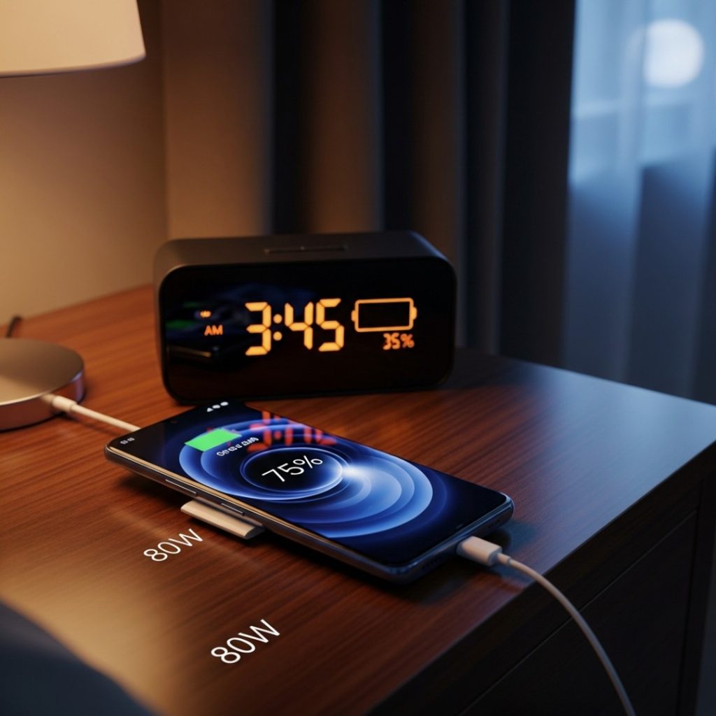 The Realme Note 15 Pro plugged into its 80W charger on a bedside table.
