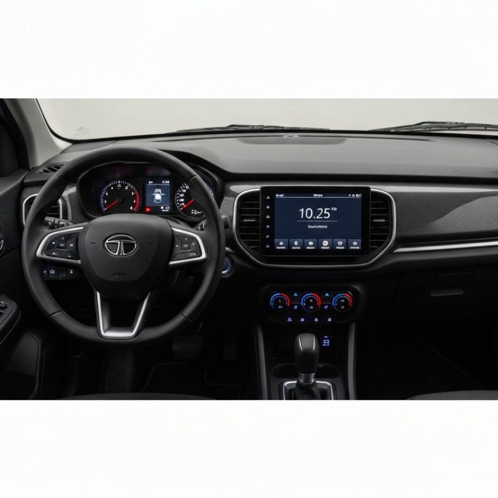 - Dashboard: You now get a massive 10.25-inch Touchscreen with a very slick UI. The steering wheel is the new two-spoke unit with an illuminated Tata logo, which feels amazing to hold.